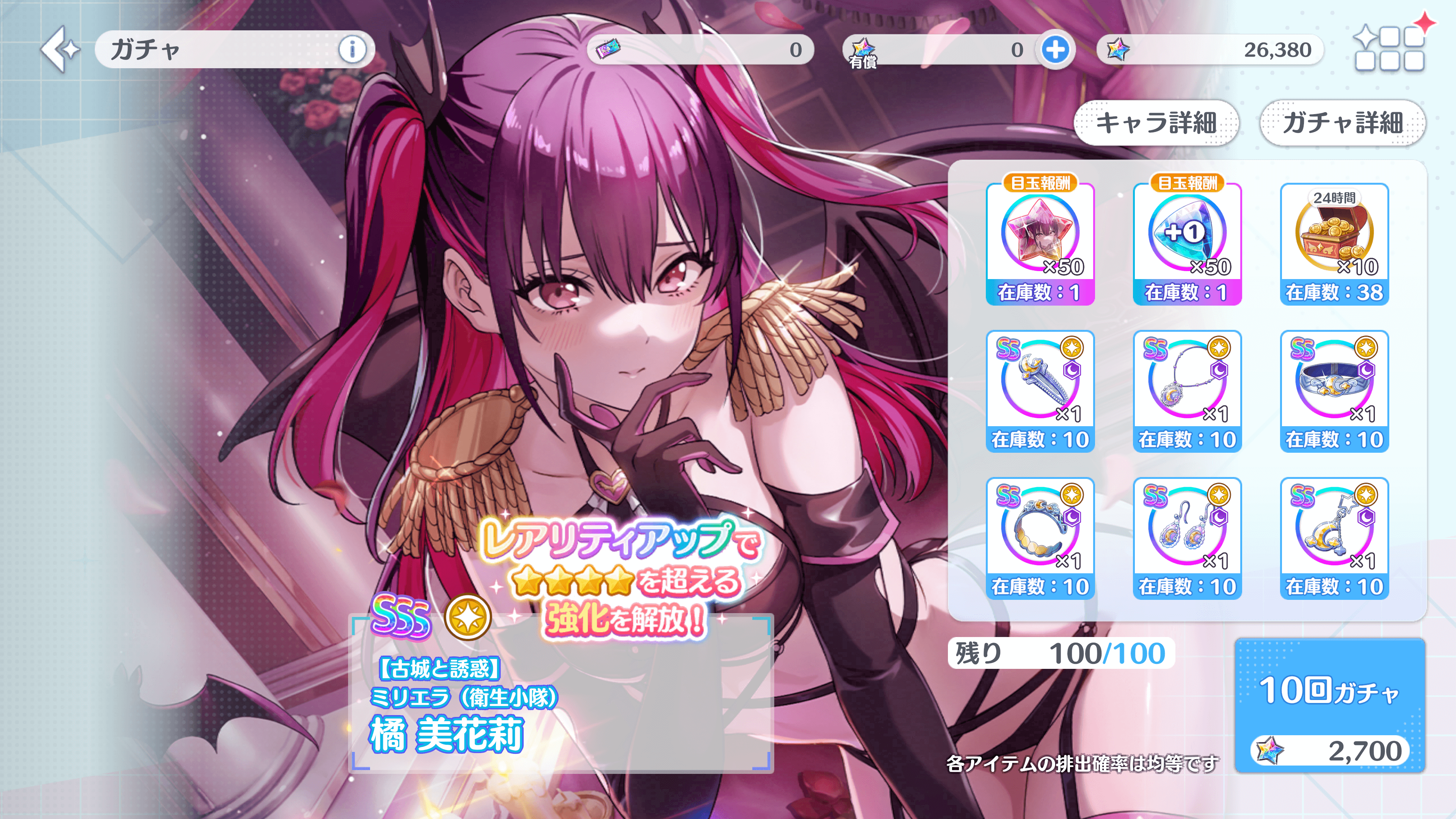 BOXガチャとなっており、10連を10回までに内容物をとりきることが可能です。